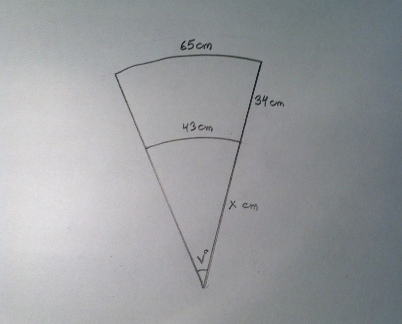 Grundförutsättning; jag har två cirkelbågar med olika längd, B1=65cm och B2=43cm, bågarna har SAMMA medelpunkt (dvs de är delar av en större och en mindre cirkel som har samma medelpunkt). Avståndet från den yttre cirkelbågen till den inre cirkelbågen, i rät/rak linje mot medelpunkten är 34cm, dvs B1's radie är 43cm+x och B2's radie är x. Jag lägger alltså cirkelbågarna på samma plats i cirklarna, så att den yttre cirkelbågen sticker ut lika mycket på båda sidor om den inre cirkelbågen. Avståndet mellan cirkelbågarna är 34 cm (men jag vet alltså inte radien för den inre cirkeln in till mittpunkten).