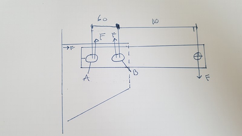 Skjuvningen ges som och vid punkten B är den som störst (eftersom arean är samma men kraften är större). Vi har ett värde för maximal skjuvning och vi har arean, så vi löser för kraften och får