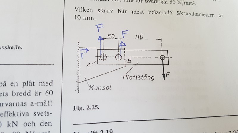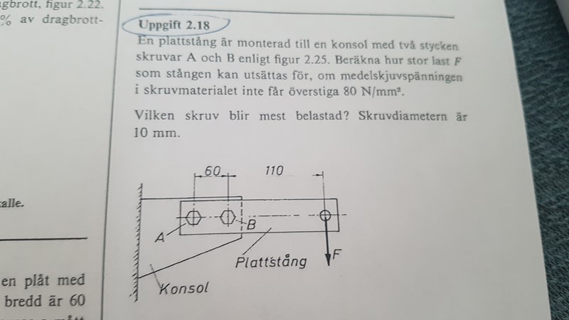 Smaragdalena skrev:Jag tänker mig en annan lösning än Affes. Plattstången kommer att försöka vrida sig kring skruven B, så . Använd medelskjuvspänningen för att beräkna och därefter .