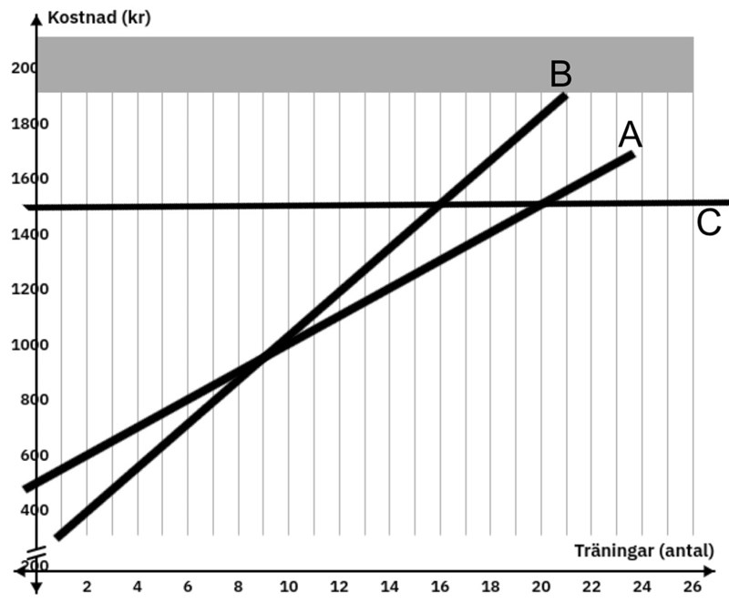 Svar: A är billigaste alternativet om man tränar mer än 9 gånger och mindre än 20 gånger under perioden.