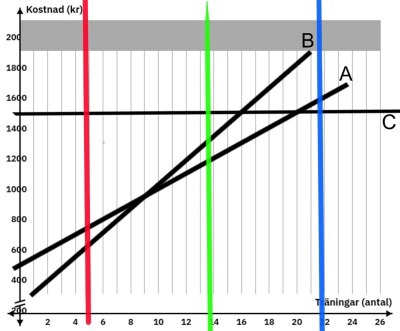 Enligt den röda till vänster är C > A > B vilket betyder att B är billigast och C är dyrast. Alltså, om du tränar få gånger är det inte värt med fast pris. Fortsätt med grön i mitten och blå till höger. Analysera och bedöm rimligheten i resultatet.