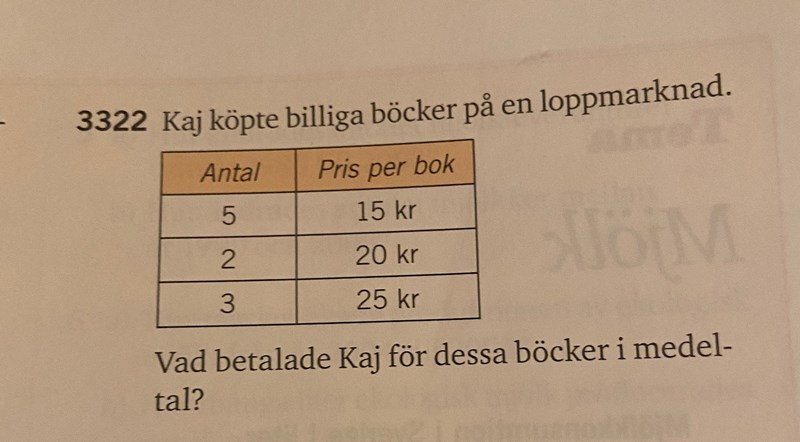 Hej jag försöker med denna uppgiften men förstår inte hur jag ska göra. Ska jag multiplicera 5*15 , 2*20 3*25 sen dela med 3?