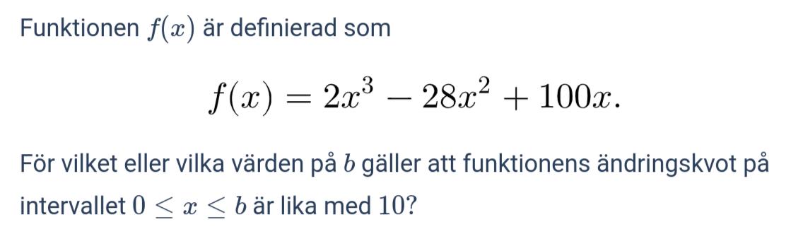 Jag tolkar den som att du ska leta efter det värde på b som gör att en korda mellan origo och (b, f(b)) har lutningen 10.