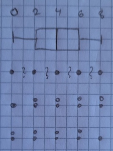 Här är ett lådagram (översta raden). Det handlar om 9 poster. 5 av punkterna motsvarar minsta värde, nedre kvartil,median, övre kvartil respektive största värde. De fyra sista värdena behöver ligga ett i varje intervall som jag har markerat med frågetecken.
