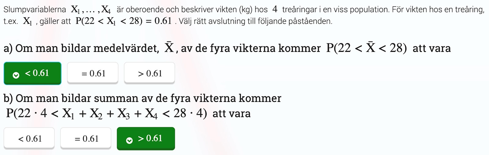 Om jag vet att sannolikheten att ett av fyra barn väger mellan 22 och 28 kg är 61%, vad säger det mig om medelvärdet för deras vikter? Jag vet inte heller om jag förstår frågebeskrivningen korrekt: menar man att barn 1 (X1) väger mellan 22 och 28 kg med 61% sannolikhet, eller menar man ett ett generellt barn väger mellan 22 och 28kg med 61% sannolikhet?