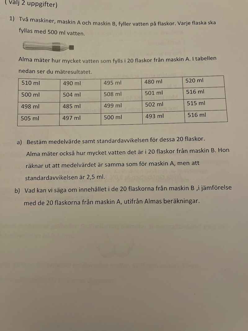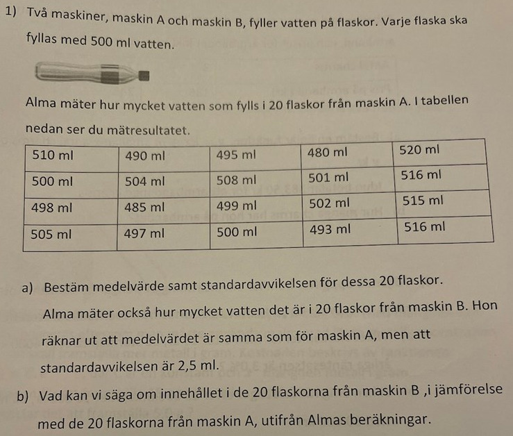 Det står att hon har räknat ut att medelvärdet är samma för maskin B som för maskin A, men att standardavvikelsen är 2,5 ml. Är det mer eller mindre än det du har räknat ut för maskin A?