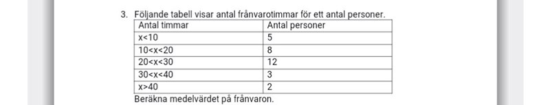 Smaragdalena skrev:Vi vet ju inte om de 5 personer som var borta mindre än 10 timmar var borta 2 timmar var eller 9 timmar var eller... men om vi gissar på 5 timmar så kan inte felet vara mer än 5 timmar, så det är den minst dåliga gissningen. Då kan vi gissa på att de 5 personerna är borta 25 timmar sammanlagt. De 8 personerna som varit borta mellan 10 och 20 timmar får värdet 15 timmar var, så de 8 har varit borta 120 timmar sammanlagt. (Vi vet ju inte hur mycket de som var borta mer än 40 timmar var borta var 45 timmar vardera).