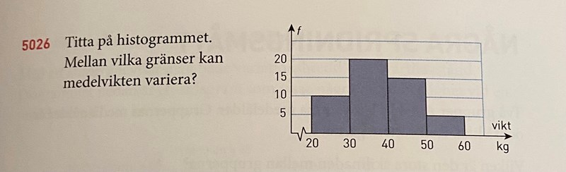 Problemet är att värdena ligger "gömda" i staplarna. Vi kan inte se om en vikt är 22kg eller 29kg, de hamnar i samma stapel ändå. Därför kan vi inte beräkna värdenas summa exakt. Men eftersom vi ser vad staplarnas minsta och största värde är (som att första stapeln innehåller värden som är minst 20 och max 30), kan vi beräkna en minsta möjliga summa, och en största möjliga summa. Och med dom kan vi med formeln beräkna minsta och största medelvärde.