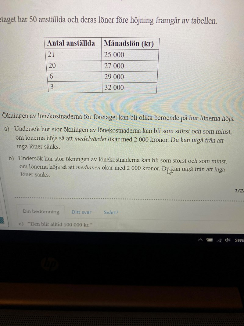 Jag tänkte att jag adderar 2000kr för varje anställd och eftersom att det är 50 anställda så adderar jag anställd nummer 25 och nummer 26 för att sedan dividera på två för att få medianen, grejen är att medianen ökar då med 2000kr jämfört med den första medianen (utan lönehöjningen) och enligt svaret skall lönekostnaden vare 34000kr?