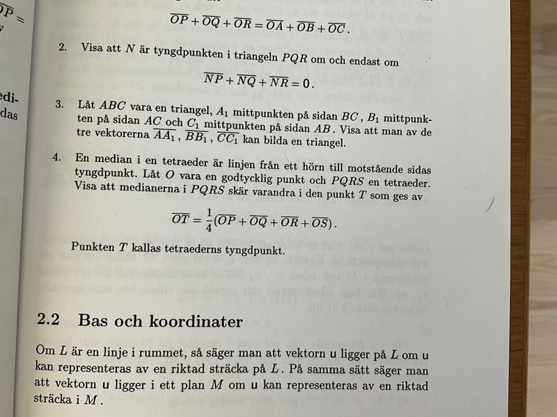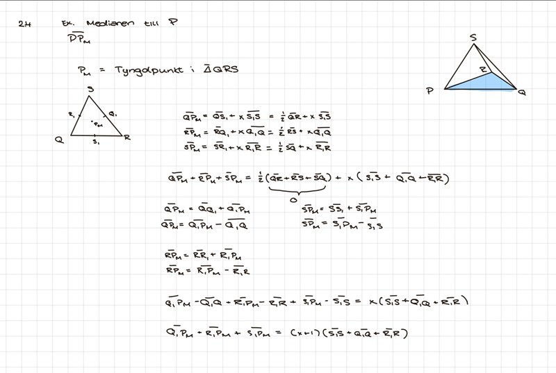 Jag jobbar på uppgift 4 (se bifogad bild). Jag försöker först härleda formeln för medelpunkten på motstående sidan till P (dvs tyngdpunkten i triangeln QRS). Jag har sett i formel att denna ska vara 1/3 av Höjen på triangeln. Här någonstans sitter jag fast, och lyckas inte komma vidare. Någon som har tips eller idéer på hur man bör fortsätta, alternativt helt annan angreppsvinkel på problemet?