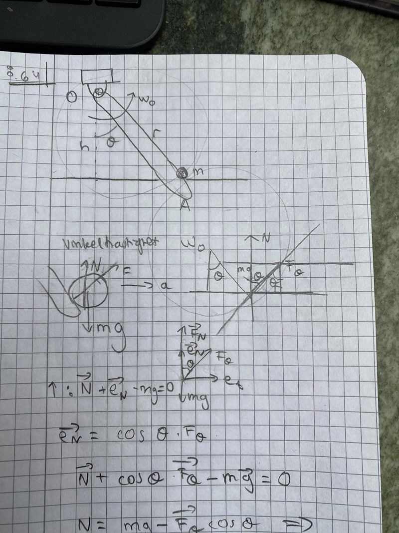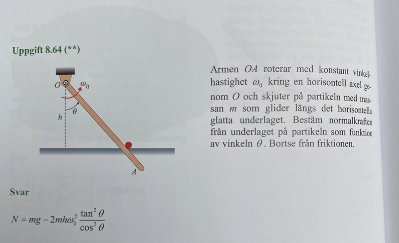 Har lite svårt med denna uppgift. Tänker att man kan rita upp krafterna på m. Där finns finns det mg, N och F som man kan dela upp i två krafter ( tangentiell kraftriktning och normalkraftriktning eN) Är det korrekt? Och hur borde man få in vinkelhastigeheten?