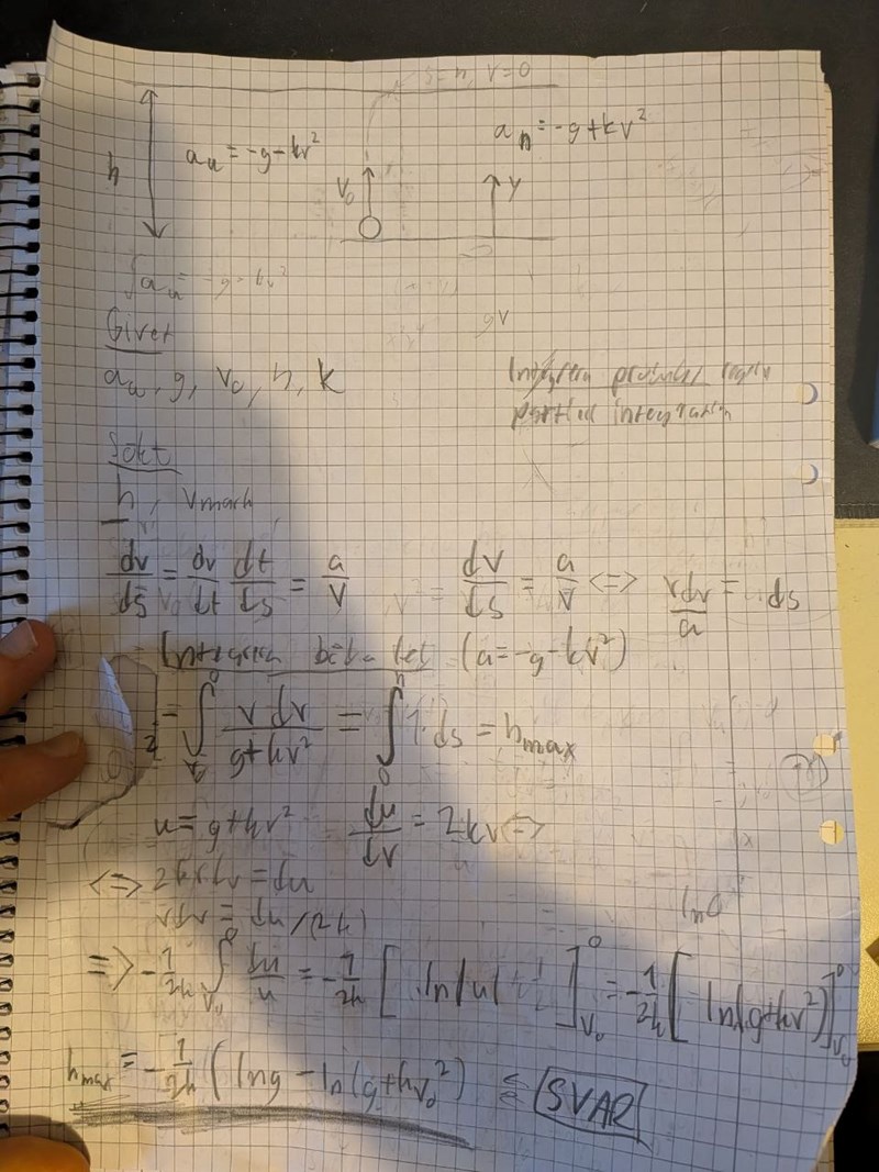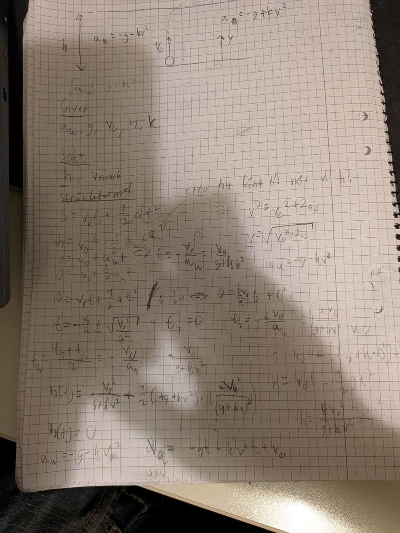 Asså jag fattar inte, jag kan inte få bort tiden ur sträckformeln. Sträckan är ju h, v0 är känt, a_u är också känt men då vet vi inte när den uppnår höjden h, alltså är tiden okänd. Då tog jag sträckformeln igen fast bytte ut med 0, hmm vänta det är ju olika acceleration dock, aja och sen fick fram ett nytt t: (2v_0)/(g+kv^2) och så substituterade jag i ekvationen för h och fick: (4v_0^2)/(g+kv^2) men v ska inte vara med. Jag antog då att hastigheten vid h är 0 vilket jag inte vet om det är sant men bollen retarderar ju hela tiden när den åker upp så jag antog det, men stoppar jag in v=0 så försvinner konstanten k vilket vi inte ville ha och det går inte heller för att v ändras ju också. Så då kanske jag borde göra något med avseende på v istället för tiden t nu när jag tänker på det.
