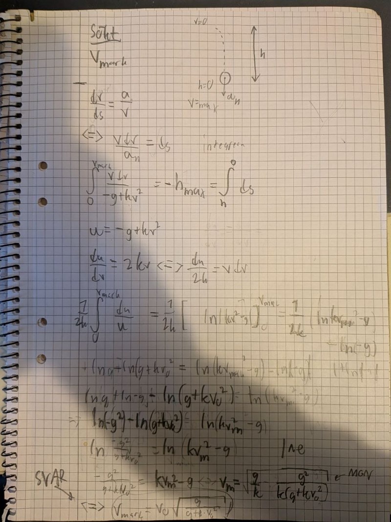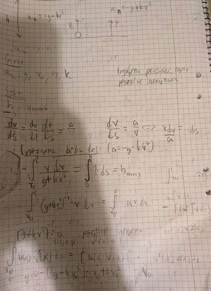 Edit: Jag prövade också att integrera accelerationen uppåt så att jag kunde få hastigheten under tiden den gick uppåt men då hade vi en start hastighet v_0 samt en annan hastighet v^2 inuti funktion v(t) så det jag kom fram till var att den lodräta hastigheten vid höjdpunkten var 0, vilket gav tiden t=v_0/g som jag då substituerede i ekvationen för sträckan efter att ha integrerat hastigheten, vilket gav att h=0, vilket är fel obviously. Jag satte också in att a_u=-g då den relevanta lodräta hastigheten vid toppen var 0.