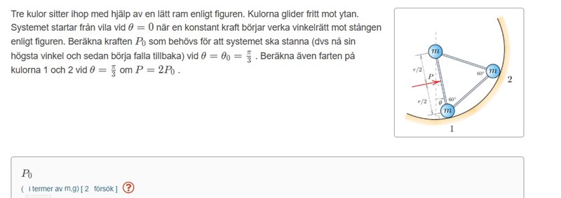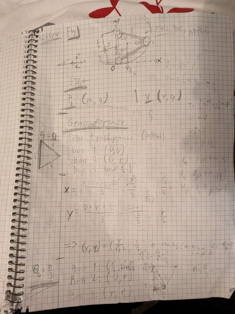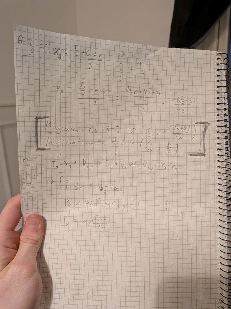 men detta stämde inte. Det jag gjorde var att jag ställde upp energi arbete ekvationen, ville räkna ut var tyngdpunkten hamna vid de olika vinklarna, insåg att kinetisk energi=0 och istället tog differensen mellan de potentiella energierna (massan ska vara 3mg också råkade skriva mg i mina beräkningar), och när jag försökte räkna ut masscentrum vid de två olika vinklarna så använda jag mig av masscentrum formeln (typ):