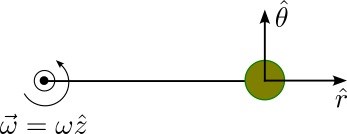 Okej vänta den pekar utmed z-axeln så vi använder den ena högerhandsregeln (den för magnetism) för att få vridmomentets riktning som då är moturs okej då förstår jag det. Sen så får vi att ... vilket känns så udda... AHhh vänta vi har egentligen två hastigheter... den ena är vinkelhastigheten som är oberoende av var vi är på denna radien och sen så har vi hastigheten v som är beroende på var vi är på längden och då är den, specifikt just där vid r, hastighetsvektorn. Dessutom är en bas precis som så vi har övergått till polära koordinater...