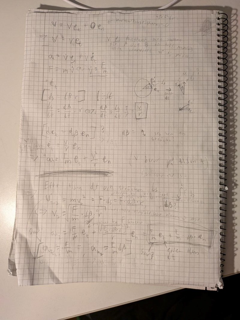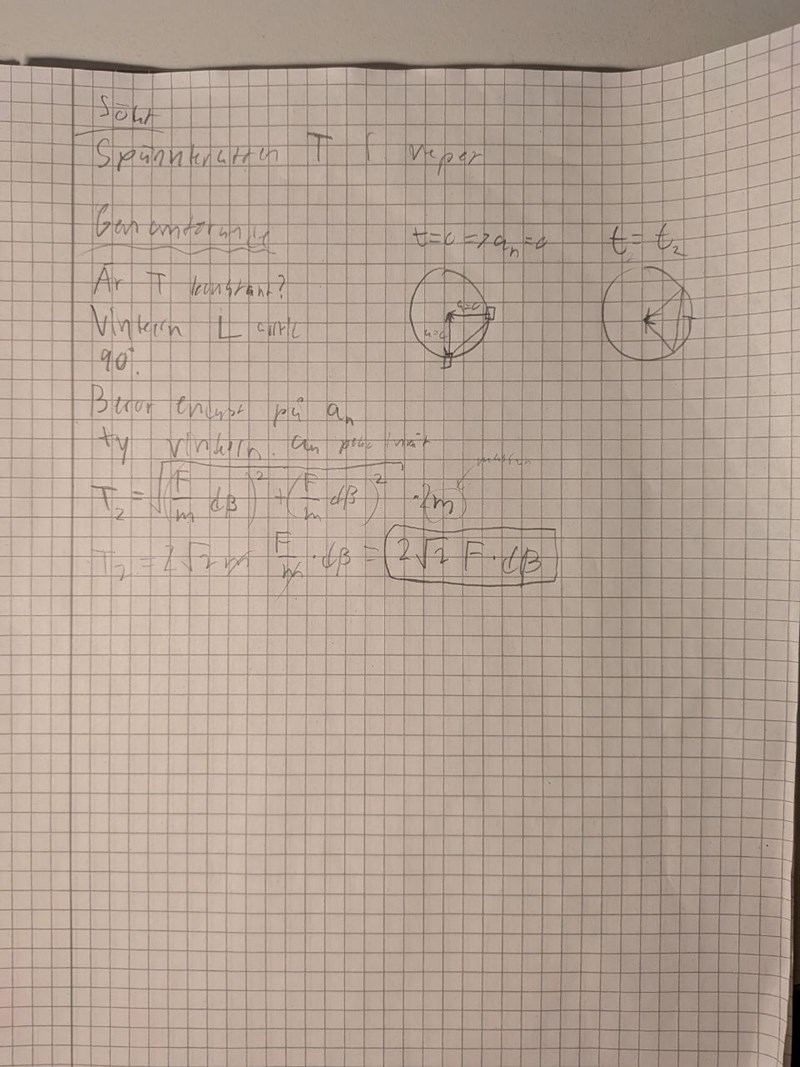Har jag löst denna på rätt sätt eller finns det något enklare, kanske bättre sätt? Jag har använt arbete och energi satsen, använt normala och tangentiella baskoordinater, antagit att normalkraften är samma för båda vagnarna då jag tror att vad dess acceleration i horisontella planet inte påverkar normalkraften (och för att friktionen är försumbar), jag har använt ekvationen för hastighet och sedan härlett ekvationen för accelerationen och sedan löst ut et och sen till slut fick jag dess accelerationer och spännkraften T. I slutet dock så använde jag formeln för pythagoras sats men eftersom T är en vektor så kanske det bara går att lägga ihop accelerationerna och sen gångra med massan (ty linjärkombination men sånt är faktiskt flummigt, kanske startar en ny tråd kring det. Men jag antar att vi faktiskt har storleken/magnituden i de olika riktningarna så pythagoras borde fungera. Sen använde jag också denna från boken som jag inte fattar varifrån de fick: