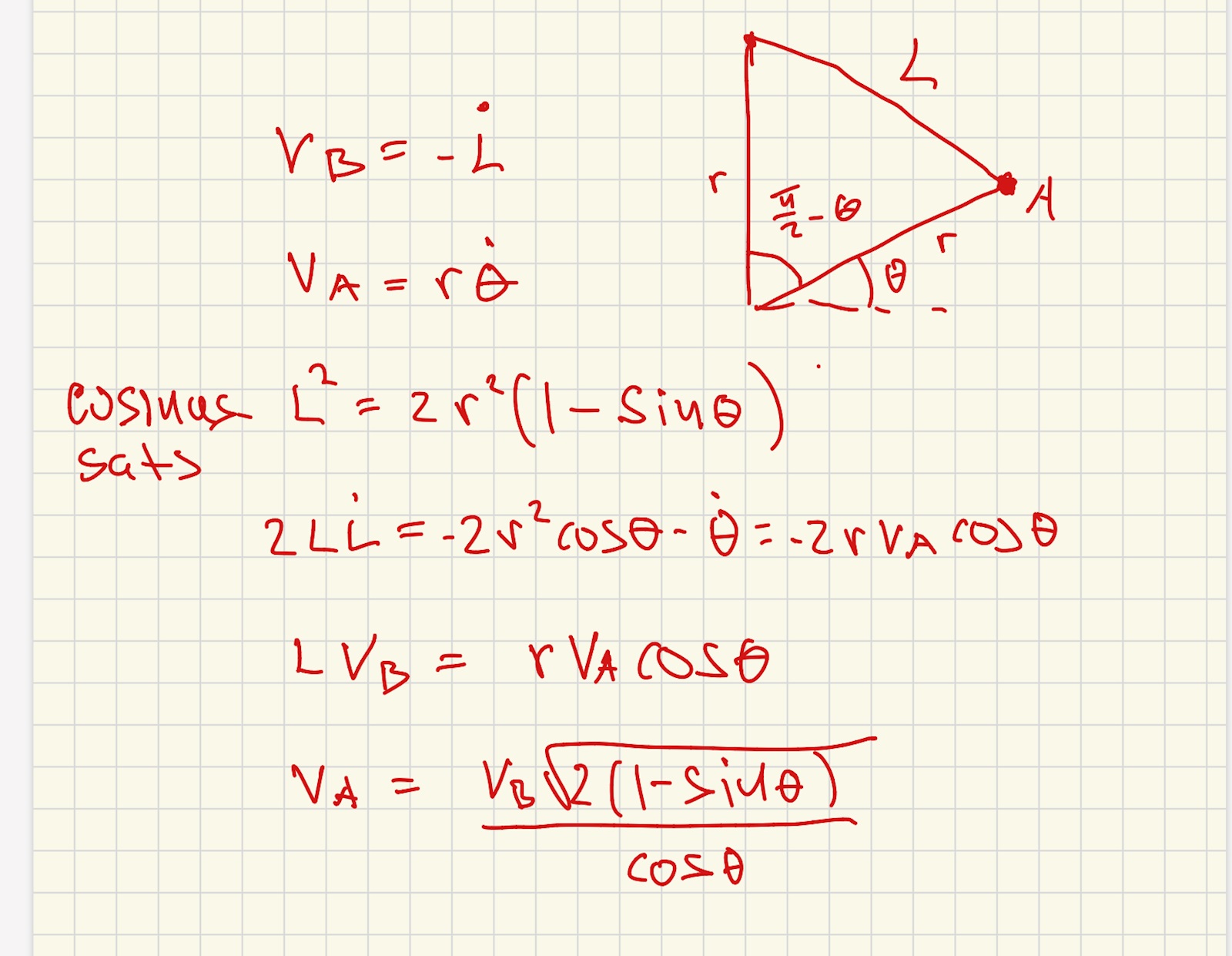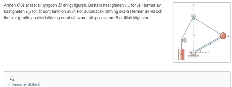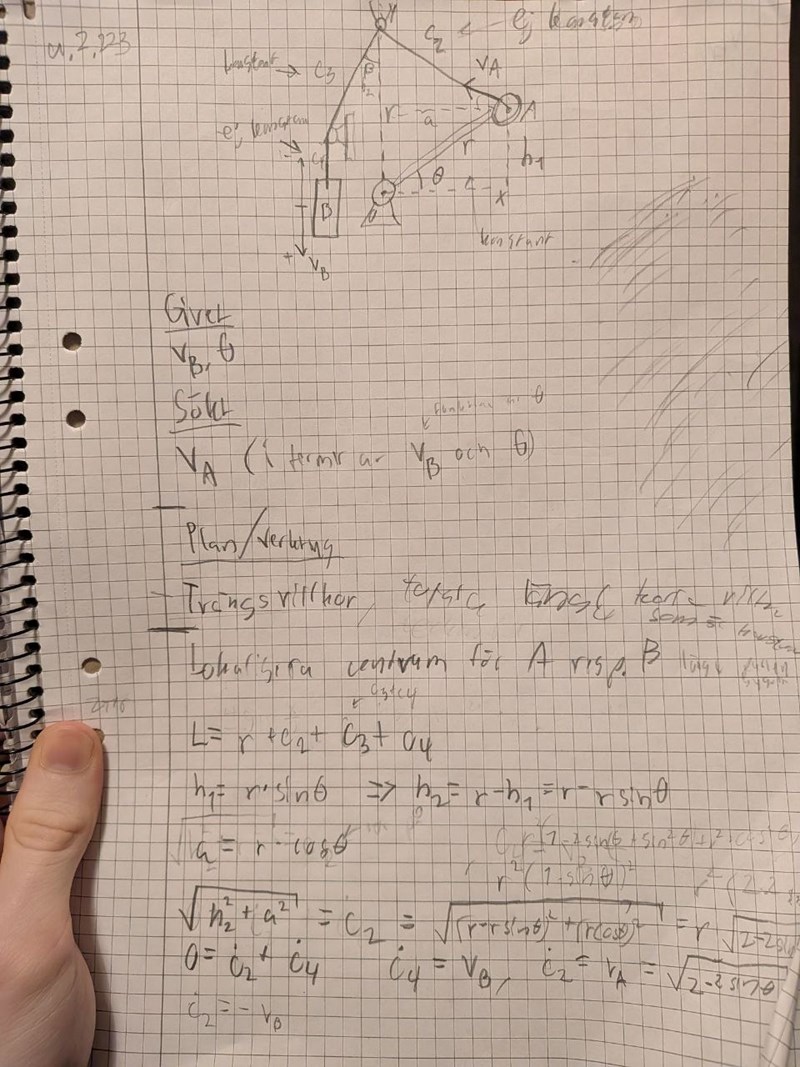 Okej så först ritade jag upp bilden, sen så försökte jag se vilka längder som var konstanta (c3 och r hade alltid samma längd). Sen ställde jag upp ekvationen för konstanta längden L = r + c2 + c3 + c4 och beräknade vad c2 var genom trigonometri och c4 = vBt. Sen deriverade jag det uttrycket för att få hastigheten... hmm vänta nu när jag tänker på det så kanske jag borde ta och addera de vertikala hastigheterna, alltså vB är vertikal, kanske ska jag ta vertikala för vA också, som borde bli negativ. Aja till slut fick jag att