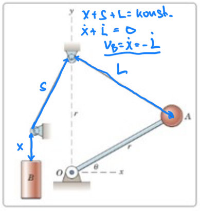Det blidde rätt men venne om jag hänger med. Jag fick ju att vA = , (fast som då var C). Hur visste du först och främst vilket tecken det skulle ha i sådana fall. Nja, om B rör sig ner ett litet stycke så minskar L med motsvarande längd. VB = -dL/dt.