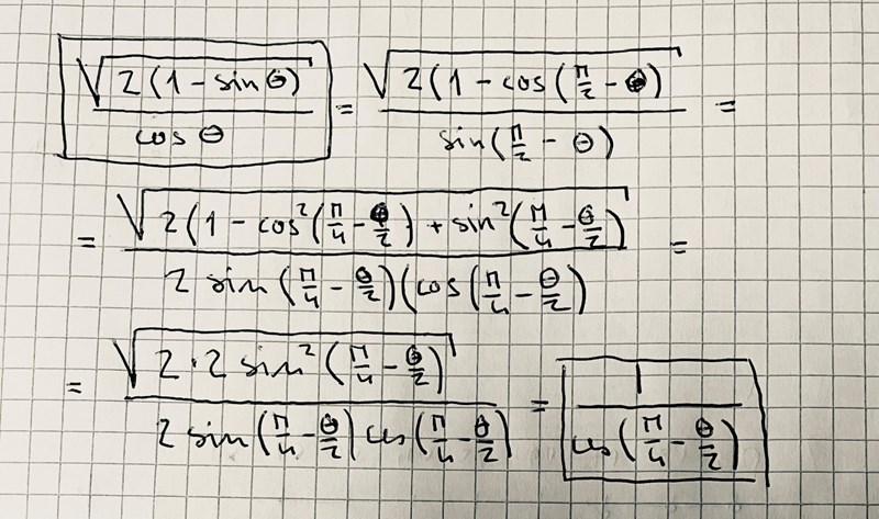 PATENTERAMERA skrev:Tror att Hansa blandat ihop vA och vB. Testa med 1/cos(pi/4-theta/2) istället.