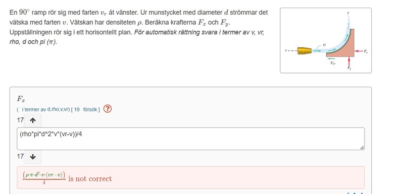 Jan Ragnar skrev:Jag har ingen erfarenhet av ämnet, men svarsuttryckets dimensioner verkar ju vara korrekt i newton. Hastigheterna vr och v är i figuren definierade mot varandra, så svaret blir noll om de är lika stora, så parentesen borde kanske vara (vr+v).