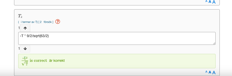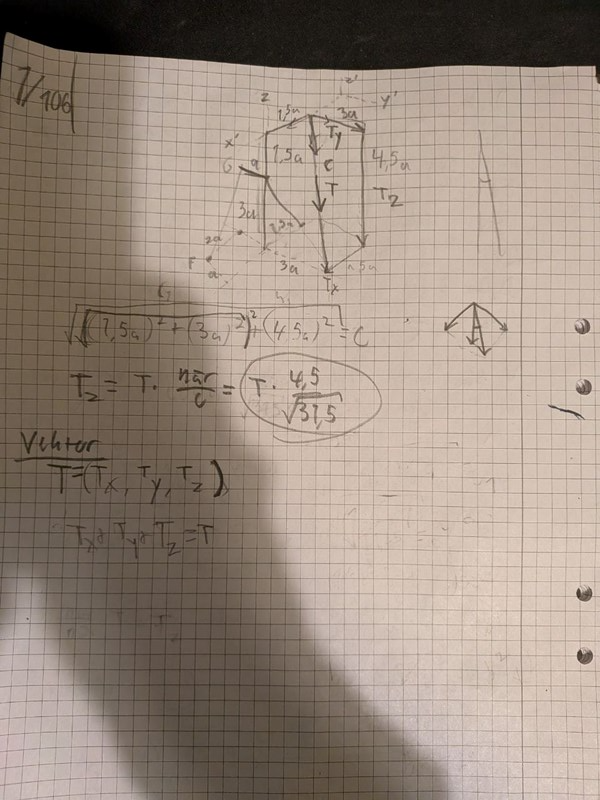 Om vi tänker att T är en vektor, och för att få Tz, tar man Tz= T * cos (alpha). Cos (alpha) får vi från bildens mått. Men det är fel, det står "exact required".