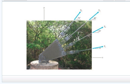 The magnitudes of the forces exerted by the cables are T1=2800N, T2=3200 N , T3= 4000 N, T4 = 5000N. What is the magnitude of the total force exerted by the four cables?