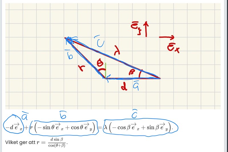 men hur är det -dex och inte +dex (samma med -cos B ex ), då går vi ju åt vänster, blir inte vektorerna omvända annars? Jaha nej vänta va, så vi har längden d, vi gångrar med -ex för att gå vänster precis som vektorn a gör och vi behöver inte ens utgå från origo, alltså vektorn a börjar inte i origo (utan spetsen hamnar där istället). Jag trodde det var det som vara hela grejen med att ha en bas (ex och ey). Aja okkk.