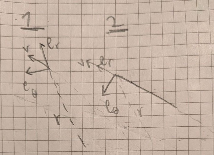 2. Om man använder tangentiell och normalbas (er och e). så förstår jag inte vilken rikting e ska vara. Liksom er är ju i samma riktning som radien men eθ kan ju antingen gå höger eller vänster. Hur ska man veta? Båda hållen är ju vinkelräta.