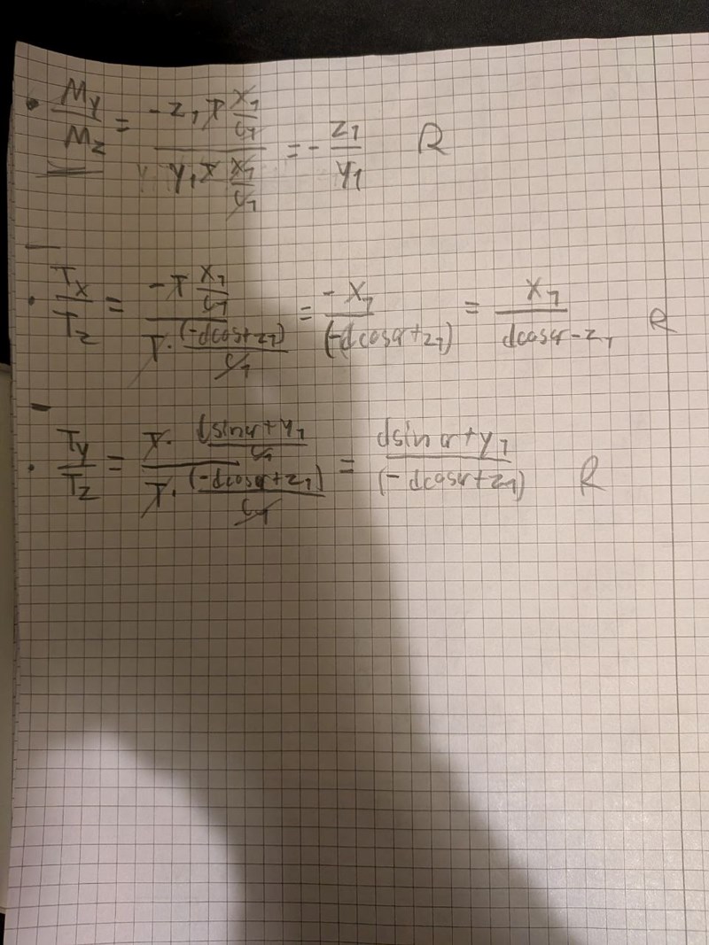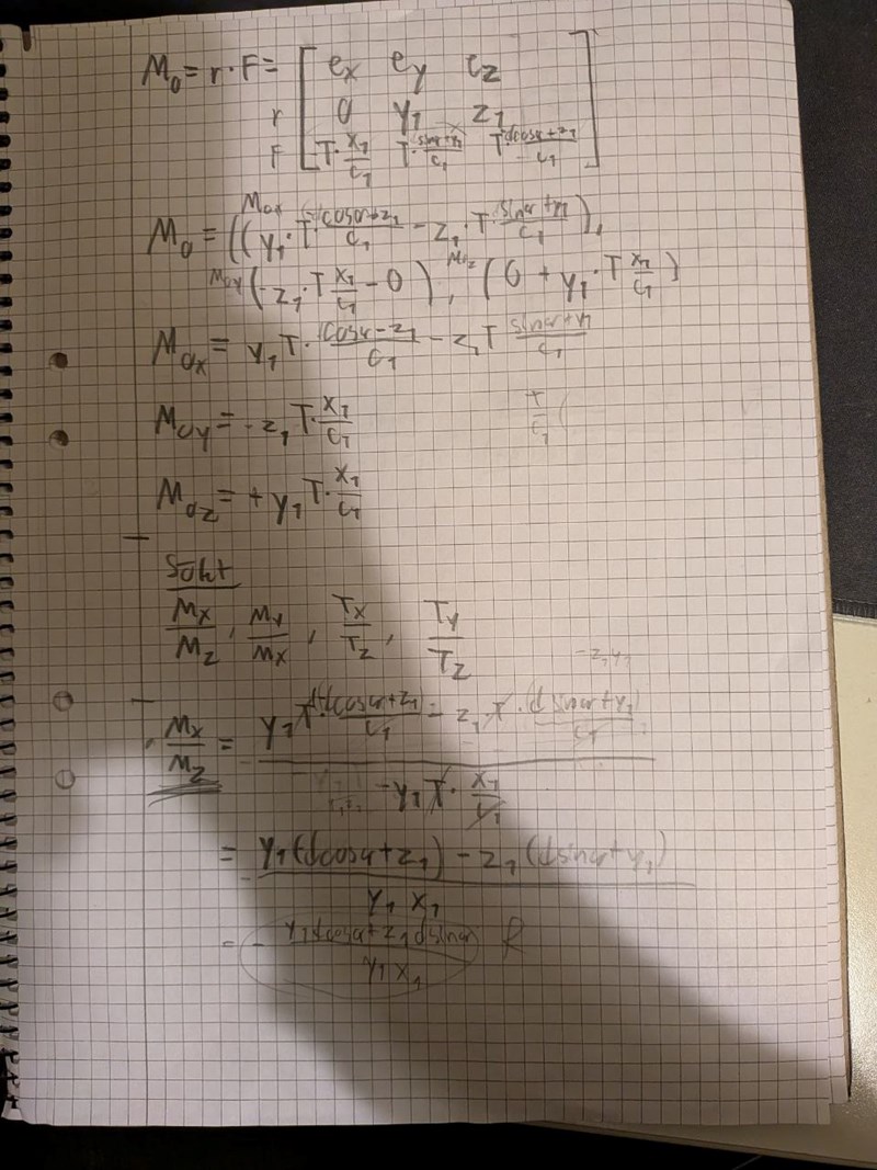 Jag fattar inte riktigt först och främst om de menar vid Mx och Mz vridmomenet med avseende på axel eller punkt. Det är också konstigt att man måste just dividera dem. Jag antar axel men uppgiften frågar för just kring O. Sen har jag också väldigt svårt att få fram z komponenten för T. Många vinklar i denna.