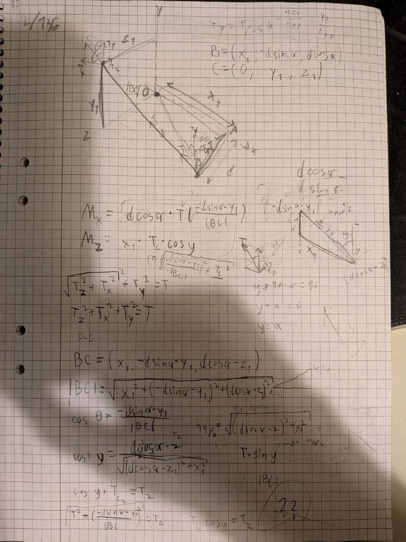 Nej och jag försökte igen och jag tycker den "klumpig"/mycket att hålla reda på. Liksom när det står Mx så går det att lägga kraften T precis vid punkten B så får man fram dess kraft komponenter. Vid punkten B så hade då komposanten Tz spelat roll om man förflyttat den lite till att vara precis under x-axeln. Avståndet till Tz hade varit dsin(α). Det jobbiga är dock att beräkna vad Tz blir för det är så många vinklar och mått och sen så är det inte origo heller sen.. Så för att beräkna vinklarna för BC börjar vi med z-komponenterna, och då är avståndet i z-ledet z1-dcos(alpha), avståndet i x-led x1 och avståndet i y-led y1+dsin(α). Sen får man fram två hypotenusor, en som är sträckan för BC och en som är dess projektion basically, då får man två vinklar där, sen ska man ta de vinklarna och gångra med T (som typ motsvarar hypotenusan/sträckan BC) för att få de olika kraftkomponenterna. SEN efter allt det här ska man beräkna vridmomentet, och sen även dela dem med varandra och samtidigt ska man hålla kolla på vad som tar ut varandra och inte. Asså det är lite för mycket för min smak.
