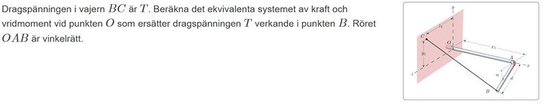 Ja mycket vinklar är det men jag tror att du slipper det mesta men inte allt om du beräknar momentet kring O med en kryssprodukt, se länk nedan (antar/hoppas att ni har gått igenom det) och behandlar momentet som en vektor. Då behöver du inte dela upp momentet i komposanter. Vid O måste det finnas ett motriktat moment eftersom det är jämvikt. Det bökigaste då, är att ta fram koordinaterna för kraften T (sätt origo t.ex vid O). Men det är "bara" geometri. Sen återstår "bara" kraften vid O. Den får du via kraftjämvikt för röret.