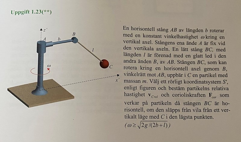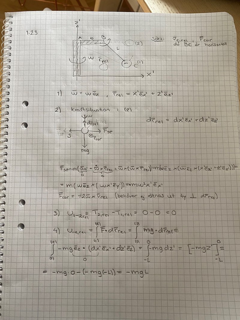 samt att man kanske ska använda Fsp i arbetet i 4). Men jag räknade inte med den eftersom jag fick det till att Fsp är vinkelrät till drrel och därför ändå blir 0. Men antar att de inte är vinkelräta? För jag tänkte i punkten C att drrel är riktad rakt upp och Fsp åt sidan då den endast har en ex komponent. Men det är uppenbarligen fel? Kan man inte betrakta kraftsituationen i punkten C? Hur ska man veta det?