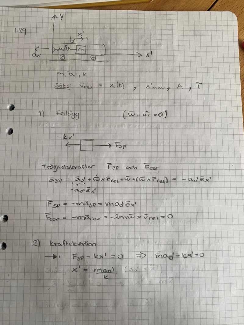 En bra början är att snitta och frilägga vikten i koordinatsystemet O'O^\prime samt märka ut krafterna som verkar på den. Det enda som är "ovanligt" är att du får en tröghetskraft (fiktiv kraft). När du märkt ut krafterna kan du räkna precis som du gjorde när du löste problemet med en vikt som släpps en bit ovanför jämviktsläget hängande i en fjäder i grundkursen. Om du är lat kan du använda formlerna och sambanden från den harmoniska oscillatorn.