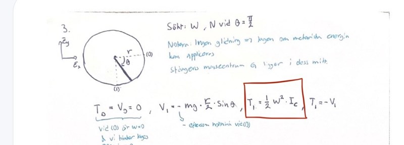 Varför kan man använda den där formeln för kinetiska energin T? Den är väl när någon roterar kring en fix axel? Är momentancenrtrum c en fixt axel? Cirkeln kommer väl liksom rulla vidare på marken och då borde man väl ta med vG:s hastighet?