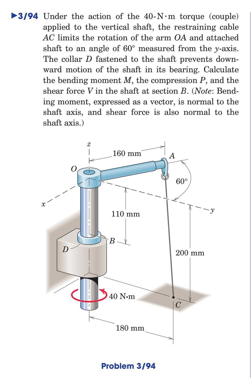 Staven utsätts för två vridmoment, en underifrån (från någon annan okänd konstruktion) med 40Nm, och den vridvektorn är parallell med staven. Det andra vridmomentet orsakas av en kraft längs AC via hävarmen OA? Den är normal till planet OAC?