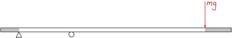 Allt till vänster om stödet vid A och till höger om personen kan du rationalisera bort i modellen. Dessa delar av balken kommer vara spänningsfria (de är spänningsfria för att det inte finns något internt motstånd mot deformation och därmed fri rörelse, försök böja en banan eller pinne och jämför själv). Dessa områden är markerade i grått nedan: