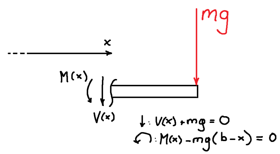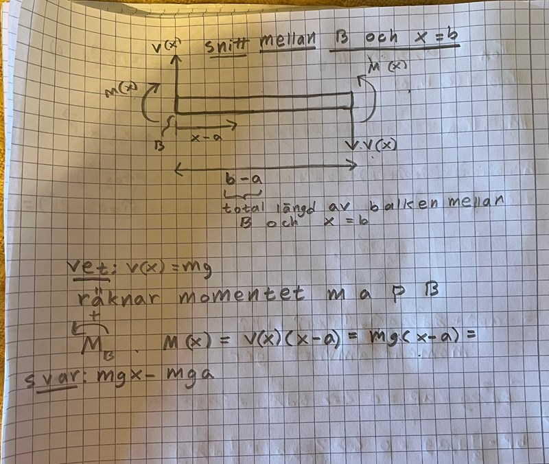 Jag försökte snitta mellan B och x = b så att mg inte kom med i snittet. Då fick V(x)=mg hävarmen (x-a) och så försökte jag räkna momentet med avseende på B, men då fick jag ett svar i termer av x, mg och b, men det rätta svaret ska uttryckas i termer av x, b och mg. Så jag har nog fortfarande inte förstått riktigt. Var går det snett?