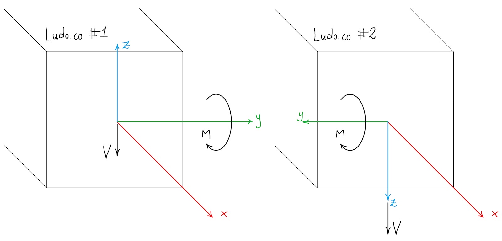 Däremot behöver du inte vara konsekvent mellan olika element. Det går bra att byta positiva riktningar mellan beräkningarna av vänstra trampolinen och den högra men det kan ju bli lite rörigt.