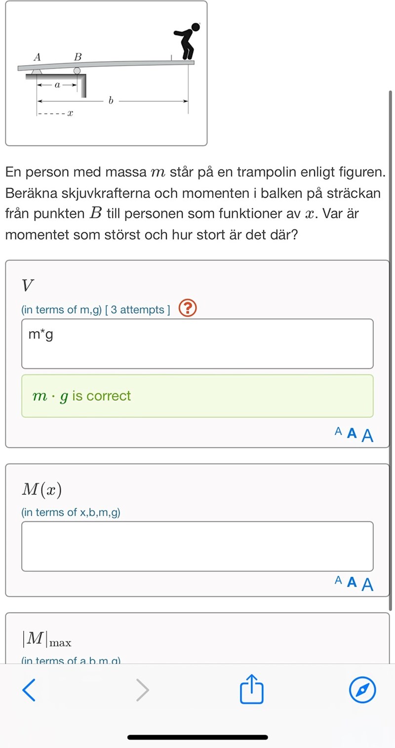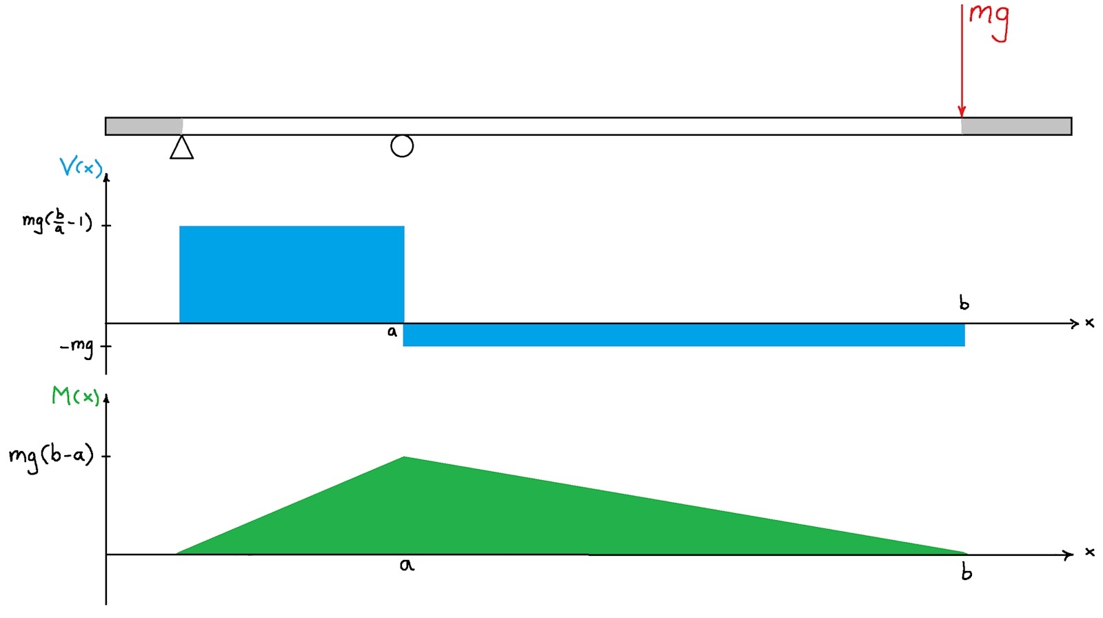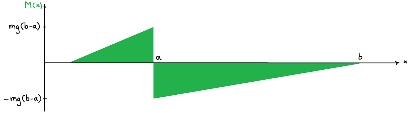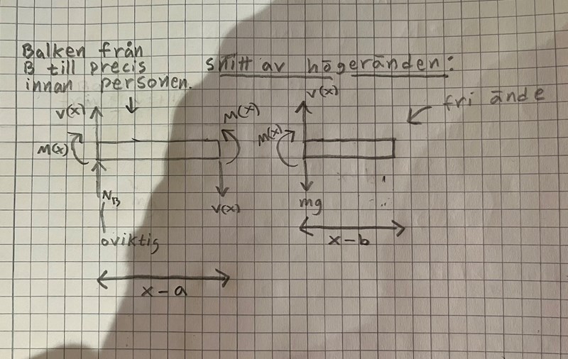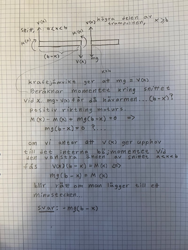 Det som hjälper dig framåt är att göra ett snitt vid x, där x>a och x<b. Sedan tittar du på den högra delen av trampolinen. Där kommer mg att finnas vid x=b. Det kommer inte att finnas något internt böjmoment M vid x=b. Vid x, d.v.s. där du har snittat kommer det att finnas en tvärkraft V(x) och ett internt böjande moment M(x). Dessa 2 storheter representerar hur den vänstra delen av trampolinen påverkar den högra. Genom att snitta har vi alltså frilagt en del av trampolinen, d.v.s. vi har ersatt resten av trampolinen med ett M och ett V.