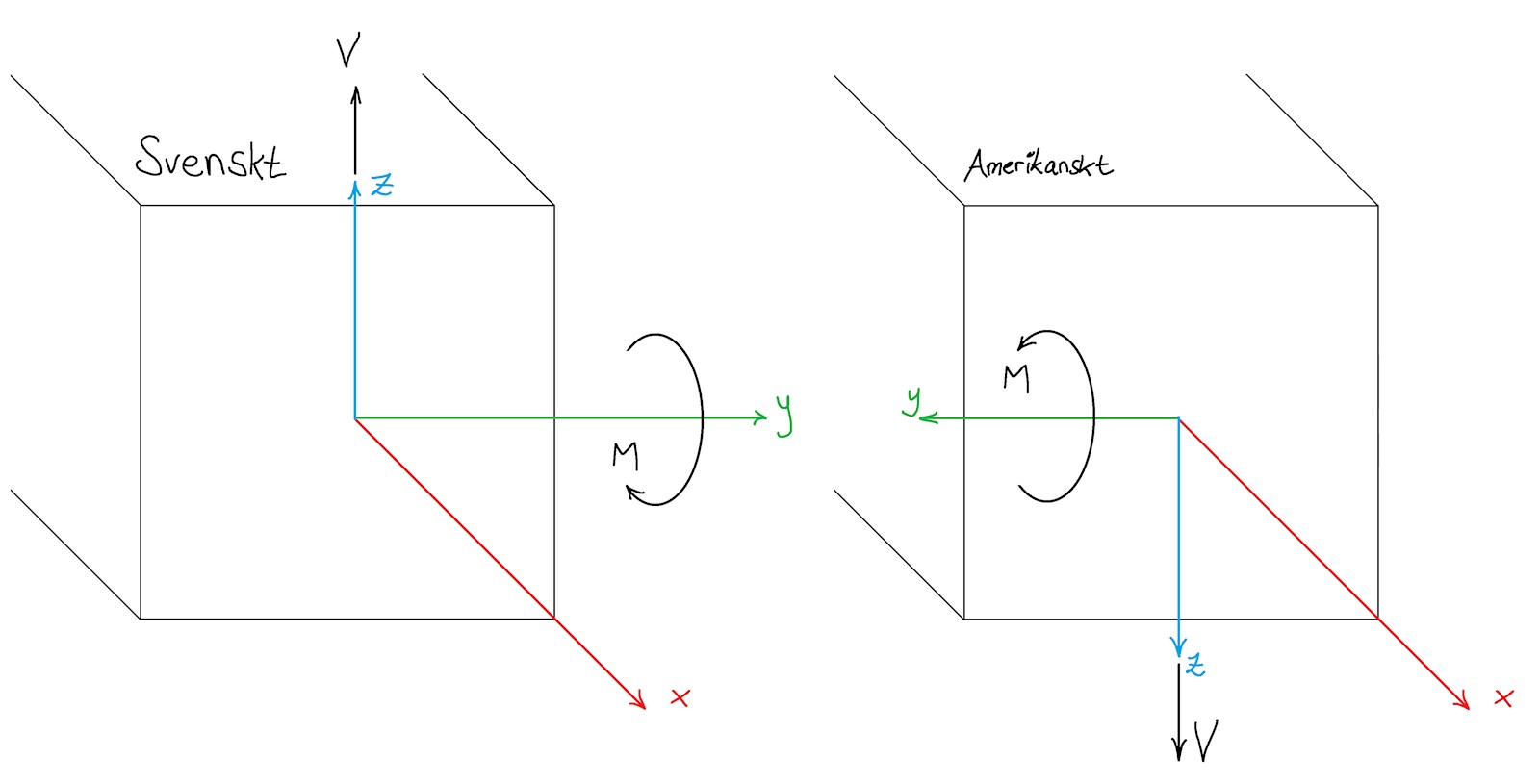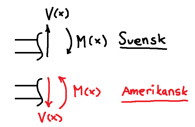 Här ser du att både moment och tvärkraft är i positiv riktning för sina respektive axlar i både svensk och amerikansk konvention.