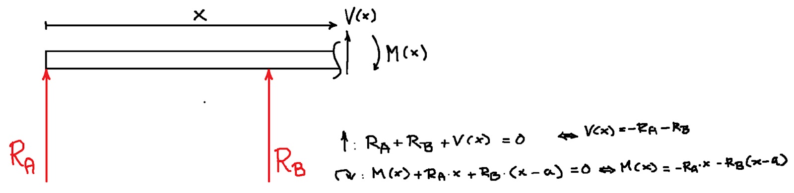 Det enklaste sättet att ta fram moment och tvärkraft som funktion av balkens längd är att göra ett s.k. positivt högersnitt. Vi kan göra det i båda delar av balken (punktkrafter och moment skapar diskontinuiteter och således olika ekvationer).
