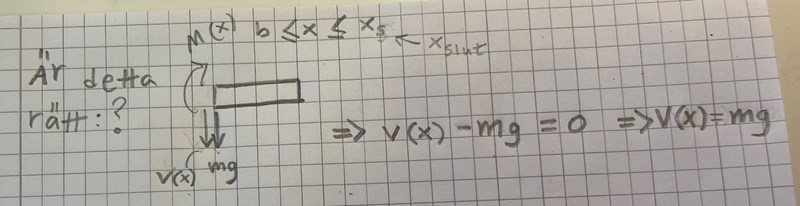 Jag förstår inte riktigt varför mg ska vara placerad längst till höger i min friläggning, eftersom personen inte står precis vid änden så borde väl det inte finnas några krafter vid den fria änden? Räcker det med att bara ändra riktning på V(x) och inte flytta mg?