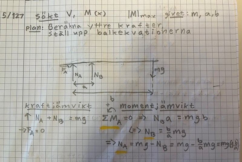Nästa steg är att sätta upp kraft- och momentjämviktsekvationer. Kraft har du redan löst och kommit fram till att V(x)=mg för x>a och x<b och att den är uppåtriktad. När det gäller momentet så är det lämpligt att beräkna moment kring snittet vid x. Vilken hävarm får då mg?
