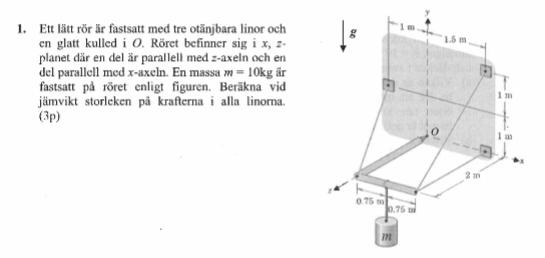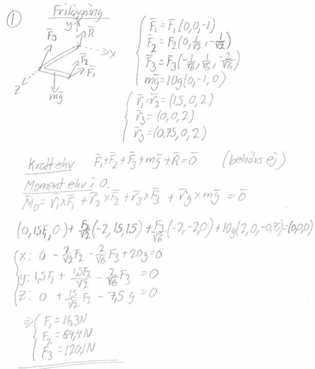 På denna uppgiften undrar jag varför det ej går att lösa ut krafterna redan vid uppställningen av krafterna? Varför behöver en räkna ut momentet för att få ut det? Jag tänker annars att jag har tre ekvationer (i x-, y- och z-led) och tre okända ()