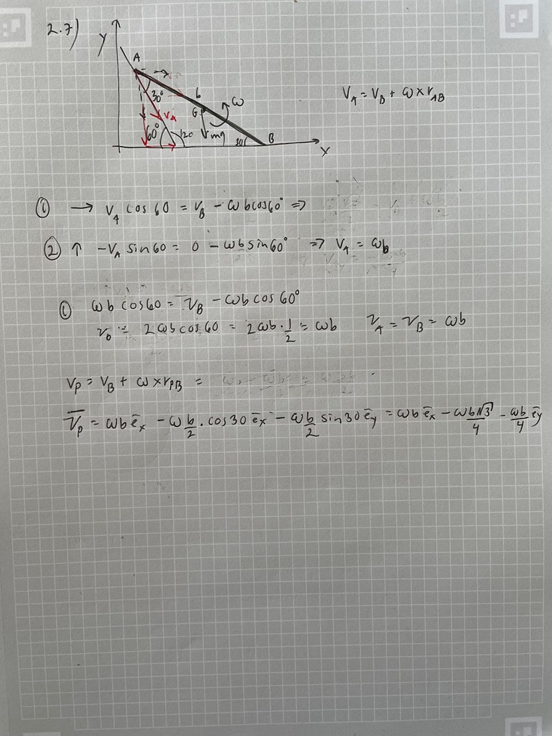 Tack! Jag är med på vad du säger. Det jag försöker göra är att beskriva hastigheten i P genom att använda formeln . Eftersom r ej följer varken x eller y delar jag upp den i två komponenter, en längs med x och en y. Dessa blir då och . b/2 är skivans längd från P till B. Detta stämmer ej enligt facit som verkar ha fått x-komponenten på uttrycket jag skrivit sin(30) och y-komponenten där jag skrivit cos(30).