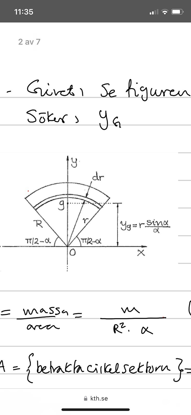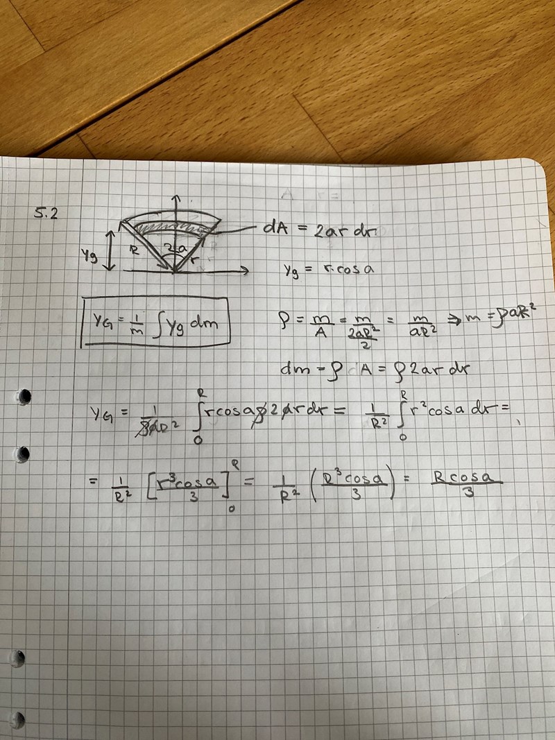 När du gör detta så skall yG vara y-koordinaten till cirkelbågens masscentrum, vilken inte har värdet rcosa. Jag misstänker att detta är vad som räknats ut i ”förra uppgiften” som man förväntas använda här.