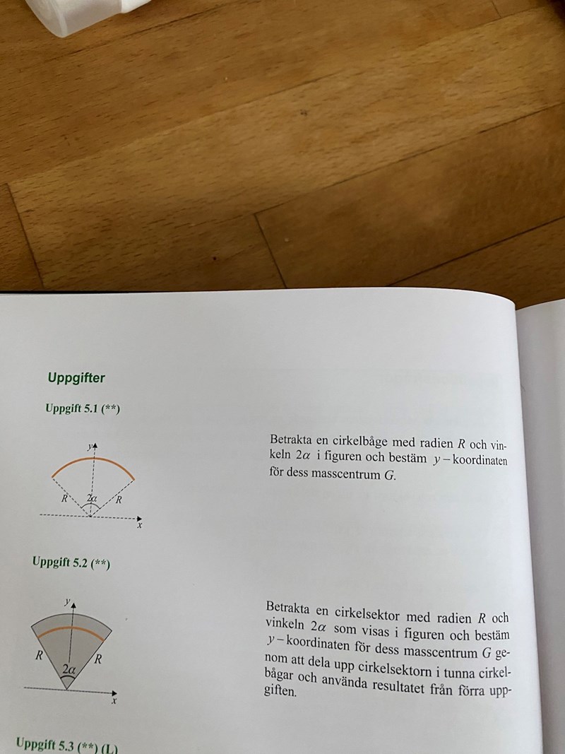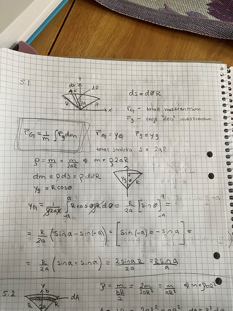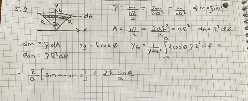 Du har ju tagit fram resultatet i 5.1. Cirkelbågen i 5.2 har radien r så y-koordinaten för dess masscentrum blir enligt 5.1 (rsina)/a. Utnyttja detta som yG när du räknar.