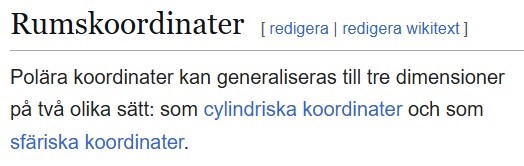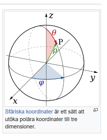 hansa skrev:Ett väldigt handfast exempel på sfäriska koordinater är jorden, där vi har latitud (phi, från -90 till +90 grader) och longitud (theta, från 0 till 360 grader (datumlinjen). En trevligt övning är storcirkelnavigering, d v s att finna kortaste vägen mellan två orter givna av sina latituder och longituder (en del av en "ekvator", storcirkel som går genom de två orterna. (Innebär t ex att ett flyg från Stockholm till LA kortast går nästan över Nordpolen).