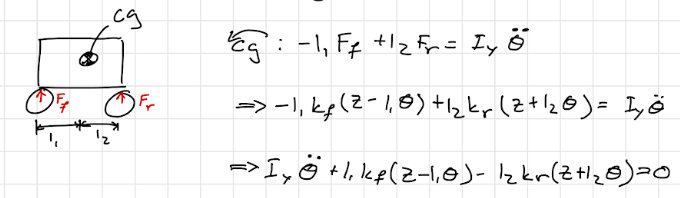 Fjädrarna strävar efter att hålla bilen någorlunda vågrät. Det innebär att förskjutningar från jämviktsläget () ska motverkas. När bilen vrids medurs som på uppgiftsbilden ska fjäder f minska sitt momentbidrag samtidigt som fjäder r ska öka sitt momentbidrag. I din föreslagna ekvation verkar det vara tvärtom.
