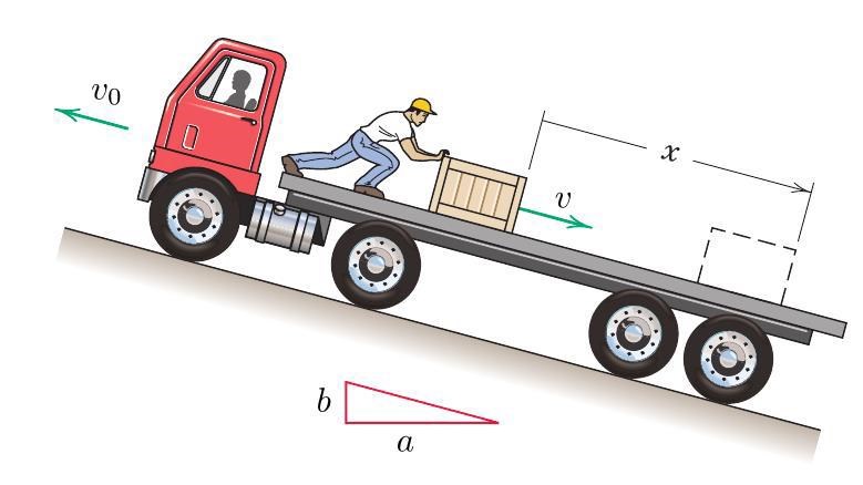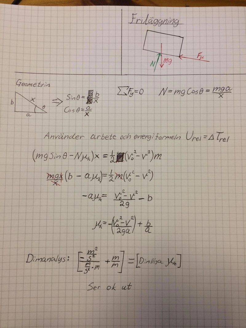 Om du använder att skillnaden i rörelseenergi är lika med utfört arbete, så är begynnelsehastigheten v och sluthastigheten 0 relativt lastbilen. Lastbilen själv verkar röra sig med konstant hastighet, så det inverkar inte. Krafterna som ger arbetet vid förflyttningen x är en komponent av tyngdkraften, mg sin A, och friktionskraften fmg cos A, där f är friktionskoefficienten. Den lilla triangeln ger cos A = a/c och sin A = b/c, där c ges av Pythagoras sats. Det är inte lika med x.